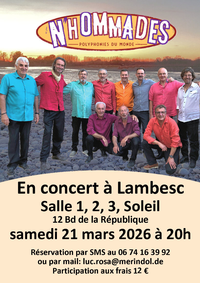 Créé en 2019 à Mallemort, l’ensemble vocal masculin « N’Hommades » compte une dizaine de chanteurs passionnés de polyphonies populaires. Il propose un itinéraire musical sans frontière, de l’Afrique à l’Amérique du Sud, du Caucase aux Pyrénées, au gré des harmonies et des émotions qu’elles soulèvent en chacun, quelle que soit sa culture d’origine. (Co-dirigé par  Robert Nageli et Luc Rosa)