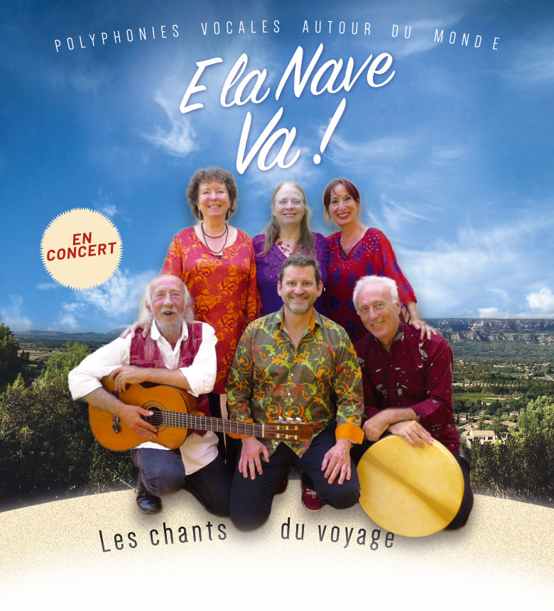 E LA NAVE VA… Les chants du voyage Groupe vocal mixte composé de trois femmes et trois hommes, E la Nave Va (… "Et vogue le Navire", comme l'aurait dit Fellini) vous convie à prendre le large en polyphonies populaires (Italie, Géorgie, Cornouailles, Séfarade, Tzigane…) ou sur des compositions originales inspirées de la tradition, parfois soutenues par quelques accords de guitare ou quelques percussions. Par moments nostalgiques et profondes, par d'autres toniques et explosives, les escales se suivent mais ne se ressemblent pas ! Embarquez donc pour un voyage musical et vocal hors du commun, avec Florence Boué, Isabelle Ruault, Régine Bordonaro, Luc Rosa, Pascal Chatard et Robert Nageli.